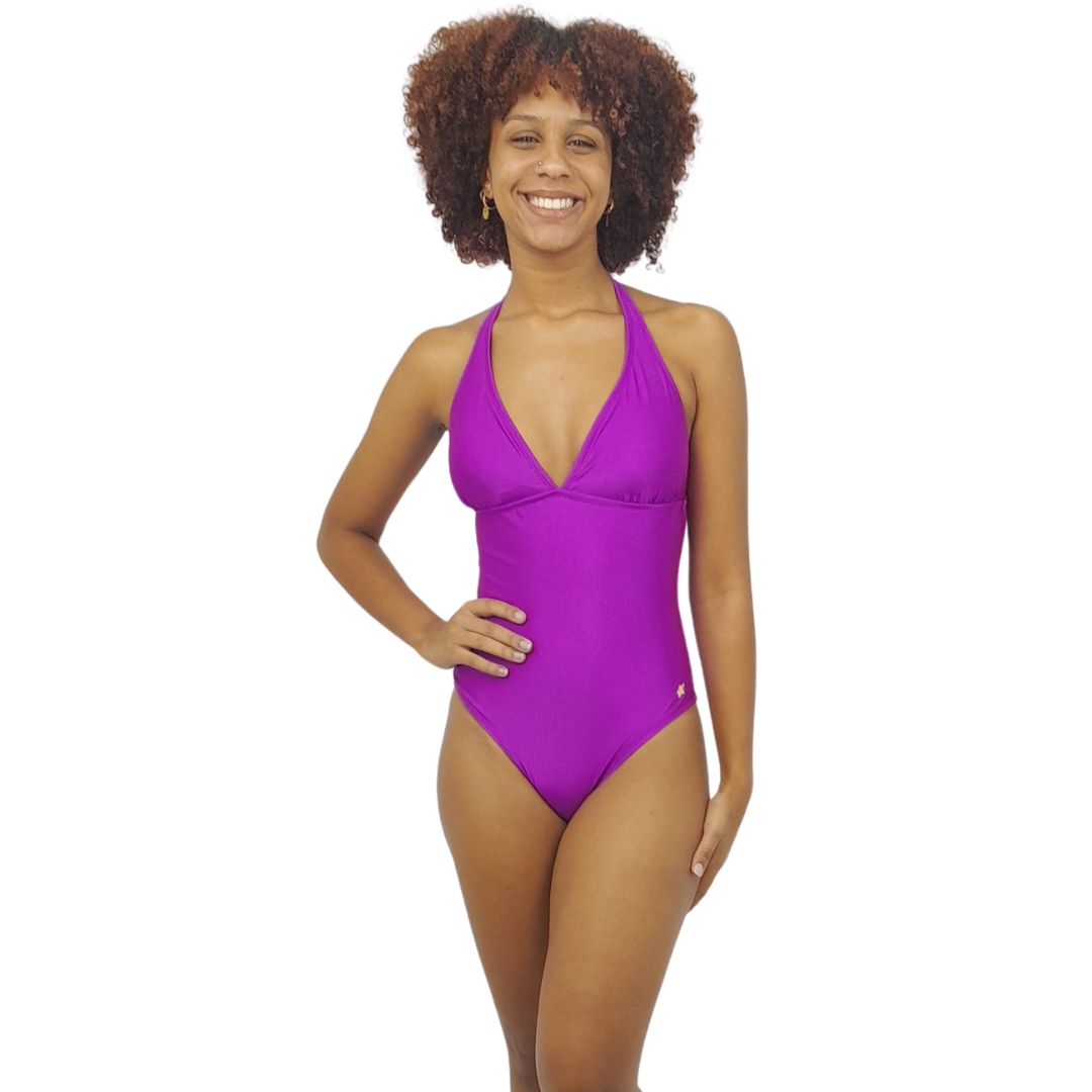 Maiô cortinão com amarração no pescoço e rocorte abaixo do busto para dar maior sustentação, modelagem ajustada na cintura para marcar a silueta, alças podendo amarrar nas costas . Tecido altamente resistente ao cloro de piscina e com proteção dos raios UVA e UVB.